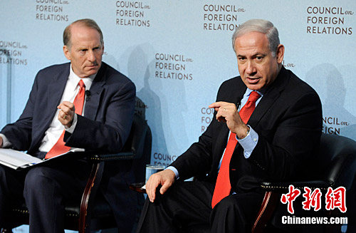 7月8日,以色列总理内塔尼亚胡在位于纽约的美国智库机构对外关系委员会发表演讲,再次重申以色列愿意与巴勒斯坦恢复“面对面”的无条件和谈。图为内塔尼亚胡(右)回答对外关系委员会主席理查德·哈斯(左)及到场会员的提问。中新社发 魏晞 摄