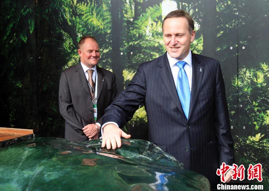 7月9日下午,新西兰总理兼旅游部部长约翰·基莅临上海世博会新西兰馆,并亲手触摸一块重达1.8吨的镇馆玉石。约翰·基希望中国世博游客多观赏该宝玉,因为玉石凸显中新两国人民息息相通的文化和情感。中新社发 潘索菲 摄