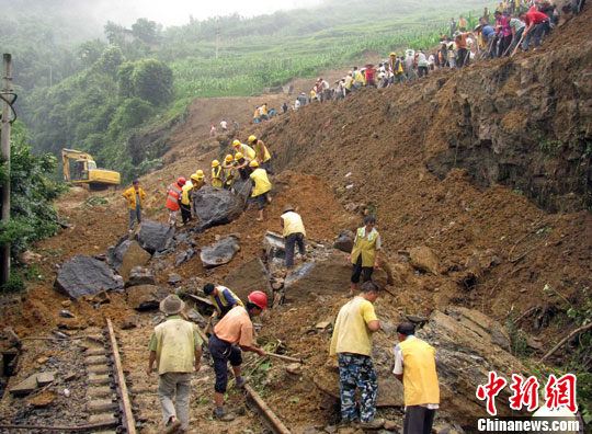 7月10日上午,因强降雨引发山体滑坡而中断的川黔铁路贵州段,经过上千名抢险救援人员连续27个多小时的奋战顺利抢通。9日凌晨,川黔铁路贵州桐梓县境内塘水溪大桥南端因暴雨发生山体滑坡,导致铁路被迫中断,滑坡量达3000立方米左右。图为水溪大桥南端山体滑坡抢救现场。 贵新供稿