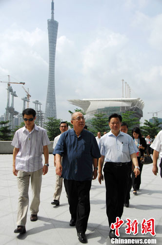 7月11日上午,在广州参加第六届两岸经贸文化论坛的中国国民党荣誉主席吴伯雄,参观了广州珠江新城的新博物馆和广州大剧院。中新社发 柯小军 摄