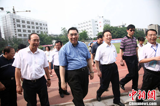 7月11日下午,澳门特首崔世安率领政府代表团抵达四川,代表团将于11日至14日期间前往成都、绵阳、广元等地震灾区,视察多个由澳门特区政府资助的援建项目,并出席川澳灾后重建高层工作会议。图为澳门特首崔世安(中)抵达澳门特区援助的绵阳市南山中学参观。中新社发 张浪 摄