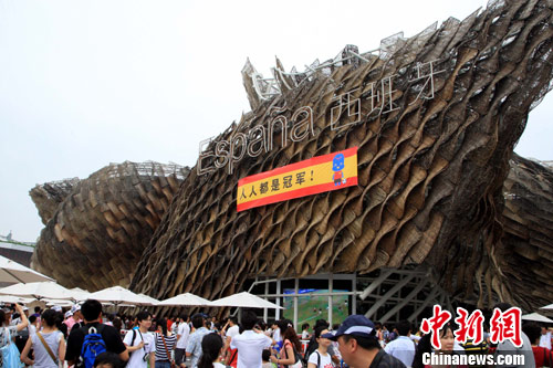 7月12日,西班牙足球队赢得2010年世界杯的大力神杯之后,上海世博会西班牙馆却醒目地高挂“人人都是冠军”的横幅,让游客分享喜悦。中新社发 潘索菲 摄