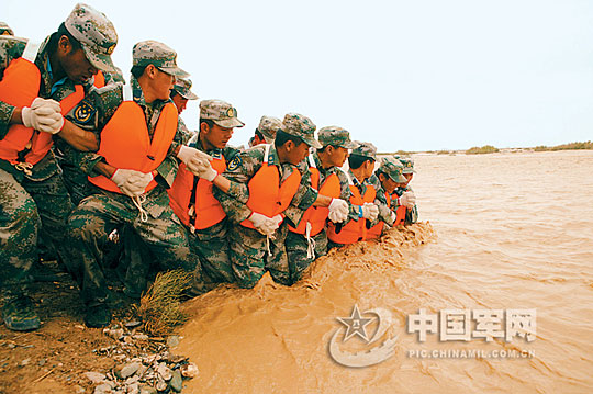 7月10日,兰空某场站官兵手挽手筑成人墙跳下格尔木河,投放沙袋改变河道流向。近日,该场站驻地昆仑山区连降大雨,格尔木市出现重大汛情,官兵们全力投入抢险战斗。芦笑若 摄
