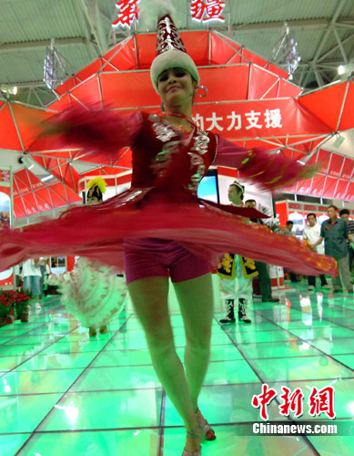 7月12日,由国家民族事务委员会、环保部、国家林业局与全国政协人口资源环境委员会主办的“西部大开发十周年生态环境与人居环境成就展”在北京全国农业展览馆隆重开幕,内蒙古、广西、重庆、四川、贵州、云南、西藏、陕西、甘肃、青海、宁夏、新疆等西部12个省、区、市,新疆生产建设兵团以及延边朝鲜族自治州参加了展出。图为新疆塔吉克族姑娘在新疆展台上载歌载舞庆祝展会开幕。 中新社发 邹宪 摄