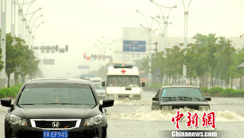 图为强降雨致使扬州主干道多处积水交通受阻,过往行车“水中游”。中新社发 崔佳明 摄
