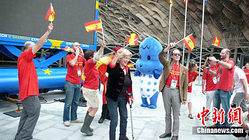 7月12日,西班牙馆工作人员穿上写有“西班牙加油!”的特制的红色T恤挥动西班牙国旗庆祝他们收获的首个“大力神”杯。当天,西班牙馆内小米宝宝还披上了西班牙特制的“围巾”。陈婷婷 摄