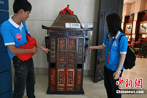 两位来自台湾高校学生被陈列在三峡博物馆内的古代花轿所吸引。孟幻 摄