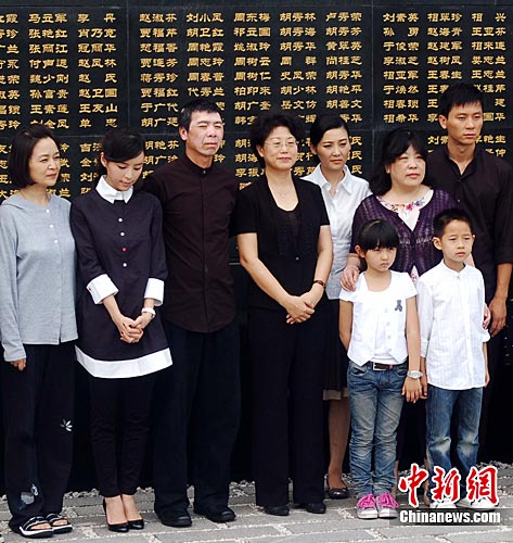 7月12日晚,电影《唐山大地震》将在河北唐山举办全球首映仪式。当日下午,导演冯小刚率剧组全体人员到唐山地震遗址纪念公园,向地震罹难的24万同胞献花表达哀思。图为冯小刚(左三)及剧组成员在地震纪念墙前悼念遇难同胞。中新社发 白云水 摄