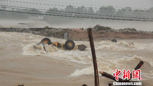 图为被抛在河中为了堵住缺口的农用车。中新社发 张娅子 摄