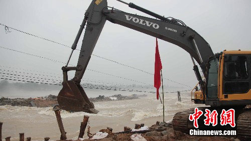 图为重型机械在现场加固河堤。中新社发 张娅子 摄