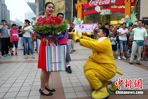 7月12日,在北京王府井步行街上,一名身着维尼熊装扮的男士,向他的女友求婚成功,引来众多民众庆贺。当日下午,求婚的男主人公抵达王府井新东安商场,一年前的今天,他与女朋友在这里相识。男主人公身着维尼熊装扮与游人拍照,当他女友出现时,看见维尼熊欢喜不已,与维尼熊拍照。这时,一幅求婚条幅从后面打了出来,随后,108朵玫瑰花、订婚戒指纷纷而至。男主人公当众表达了对女友的爱意,单膝跪地,捧上鲜花与戒指,女主人公当场喜极而泣,同意了他的请求。中新社发 富田 摄