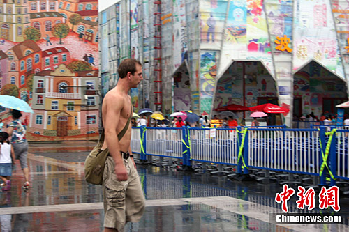 图为外国游客脱掉上衣冒雨逛世博。中新网记者 张晓涛 摄