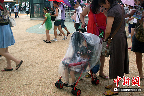 图为游客在为婴儿车安装雨具。中新网记者 张晓涛 摄