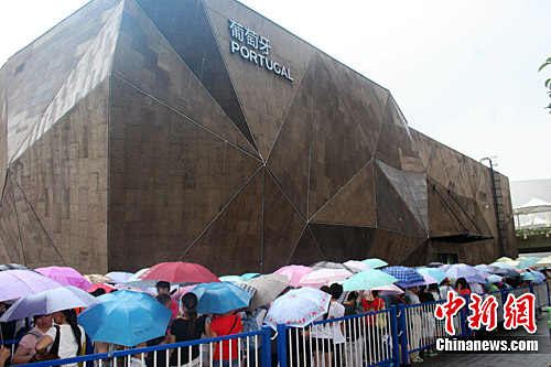 图为世博游客冒雨在葡萄牙馆外排队。中新网记者 张晓涛 摄