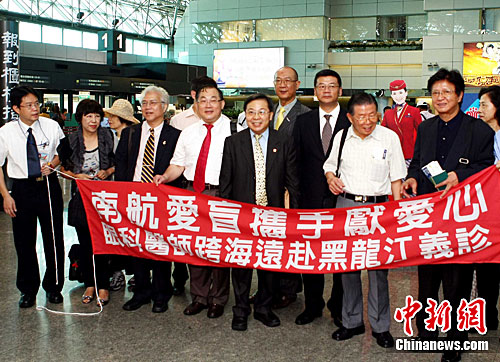 7月13日,台湾爱盲协会13位医师爱心人士组成的医疗团,从台湾桃园机场乘坐中国南方航空公司台湾分公司免费提供的航空服务,前往黑龙江省,在7天时间里为哈尔滨、齐齐哈尔等地350名贫困白内障人士实施手术并赠送优质人工水晶体,使患者重获光明。中新社发 宋吉河 摄