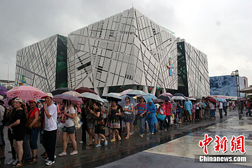图为人们在世博展馆外排队等候。中新网记者 张晓涛 摄