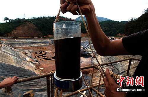 福建省龙岩市上杭县于12日下午召开新闻发布会,通报上杭紫金矿业集团股份有限公司紫金山铜矿湿法厂污水渗漏事故。据悉,有9100立方米的含铜酸水外渗引发汀江流域污染,并导致汀江流域和位于永定县境内的棉花滩库区出现大面积死鱼和鱼中毒浮起现象,据初步统计,仅棉花滩库区死鱼和鱼中毒约达378万斤。福建省有关部门初步认定此次污染属重大突发环境事件。