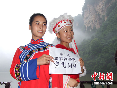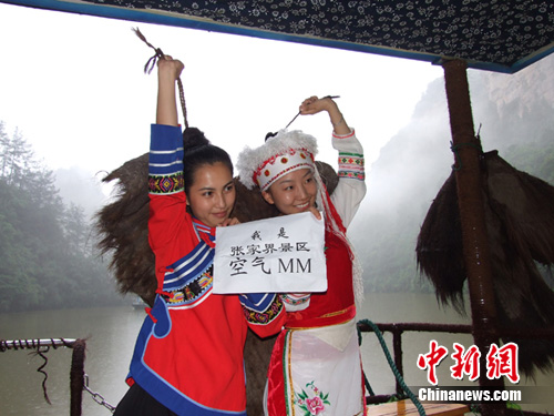 张家界国家森林公园空气中负氧离子的含量达每立方厘米10万个,是个名副其实的天然氧吧。为了吸引更多游客来张家界呼吸清新的空气,两位自称“空气妹妹”的少数民族女孩近日在张家界宝峰湖景区自发向中外游客推荐这一新特产——张家界空气。周芦屾 摄