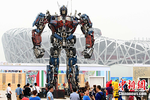 7月13日,全球首座以玩乐探索绿色趣味为主题的“绿色探索乐园”向媒体开放,乐园坐落于鸟巢北侧广场,将于7月16日正式接待游客。该乐园提供众多探索“绿创意、绿时尚、绿生活”的创意玩乐,许多生活中被人们当作废品的东西,在园区都可能转变成互动性强的创意空间、娱乐设施、生活必需品等。图为一座高11.5米,重6吨,全部用汽车零件搭建而成的变形金刚矗立在乐园中。中新社发 富田 摄