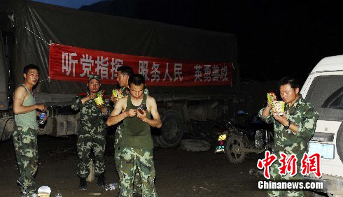 7月13日凌晨4时许,云南昭通巧家县小河镇发生山洪灾害,初步统计已造成12人死亡、32人失踪、43人受伤,并有50余户民房在灾害中倒塌、损毁。图为第一时间到达救灾现场的武警官兵。中新社发 田洪 摄