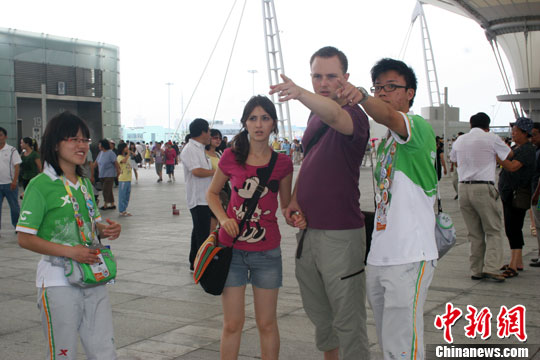 7月14日,香港“小白菜”(志愿者)们在世博园内上岗第三日,他们热情的服务、友好的态度、美丽的微笑赢得了游客的称赞。大约有100名左右来自香港的志愿者12日起开始在世博园内为游客服务,他们表示上岗三天以来很开心,希望为世博贡献自己的力量。