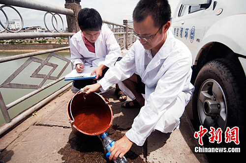 7月14日,福建上杭环保局工作人员每隔一小时抽取汀江水做检测,实时监控因紫金矿业污水泄露对汀江水造成的污染情况。受福建境内前段时间持续强降雨影响,福建省上杭县紫金山铜矿湿法厂污水池处于高水位运行,7月3日该污水池水位异常下降,池内酸性含铜污水出现渗漏,有9100立方米的含铜酸水外渗引发汀江流域污染,并导致汀江流域和位于永定县境内的棉花滩库区出现大面积死鱼和鱼中毒浮起现象,据初步统计,仅棉花滩库区死鱼和鱼中毒约达378万斤。福建省有关部门初步认定此次污染属重大突发环境事件。