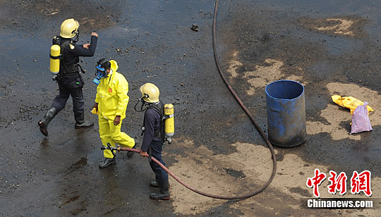 图为当地消防等部门的工作人员正在对氯气进行稀释。