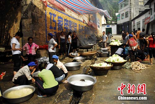 7月14日,巧家小河镇电影院门口,当地政府正组织为临时安置点灾民做饭。记者了解到,在小河镇这样的做饭点设立了三个,保障了所有灾民都能吃上可口的饭菜。中新社发 田洪 摄