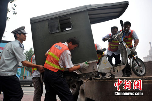 七月十四日,北京警方在全市范围内继续开展“脉冲行动”,对各类黑车、黑摩的非法营运等问题进行整治。中新社发 李连杰 摄