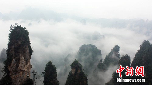 7月14日,湖南张家界国家森林公园黄石寨景区,雨后放晴出现壮观神奇的云海美景,数千名海内外游客同赏自然奇观。中新社发 邓道理 摄