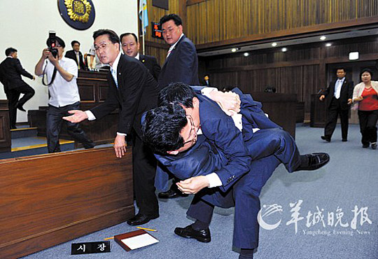 7月13日,韩国蔚山市,议员在开会时发生肢体冲突,两人打架抱在一起。