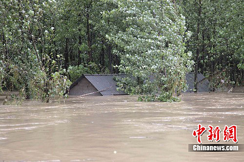 图为安徽池州秋浦河边农田和民房被淹。中新社发 张娅子 摄
