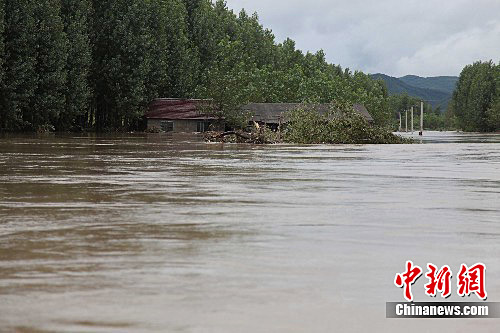 图为安徽池州秋浦河边农田和民房被淹。中新社发 张娅子 摄
