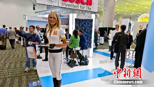图为商家请来美女站台,吸引参观者。中新社发 陈钢 摄