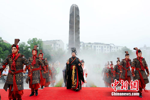 7月15日上午, 身穿古代服饰的演员表演越王入城。,当日 浙江绍兴市在城市起源地越王城举行隆重仪式纪念建城2500年。 800多位中外来宾、向古城悠久历史致敬,为绍兴美好未来祈福。庆典仪式上,举行了绍兴“建城2500年城雕”揭幕,绍兴博物馆越王城馆开馆和《绍兴建城2500年》纪念邮资明信片首发仪式等。 绍兴始建于公元前490年,现有437万人口,面积8000多平方公里,有水乡、书法之乡、戏曲之乡、名士之乡等美誉,曾获得联合国人居奖。中新社发 袁云 摄