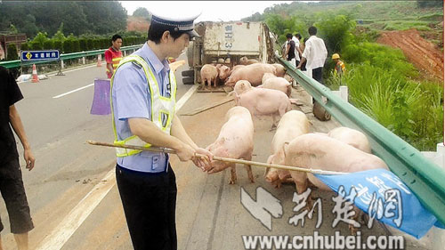 7月12日13时左右,荆宜高速公路76公里处,一辆运载着40头生猪的货车发生侧翻,部分死猪尸体横在路面,受到惊吓的生猪在高速公路上四处乱窜,过往车辆慌忙避让,险象环生。省高管十六大队民警赶到现场后,与附近道路施工人员一道,将生猪控制在应急车道内。随后,民警联系转运货车,与施工人员、车主、路政人员、施救员工合力将现场的死猪和36头生猪全部进行了转运。3个小时后,现场清理完毕,道路交通恢复正常。(楚瑜 郭帅 摄)