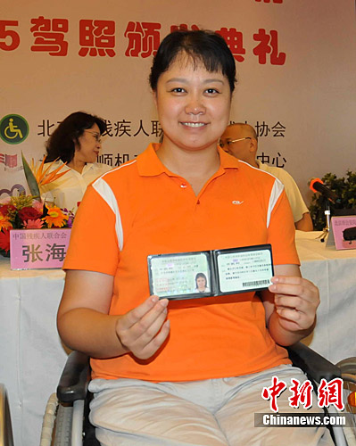 图为轮椅击剑世界冠军齐凯利第一个领取驾驶证后向人们展示她的驾证。中新社发 潘旭临 摄