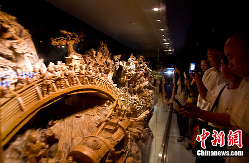 7月16日,上海世博会河南馆,大型根雕《清明上河图》吸引大批游客关注。根雕高2.56米、宽2.1米、长18米,重达12吨,是目前世界上最大的根雕。这件根雕的原料是从东南亚进口的一整棵香樟古木,树高百米,树干直径4米,根径20米,有2300年树龄,完全暴露风干近10年。由35位艺术家和工匠用了5年时间制作而成,并根据木头的纹理分段切割,最后经由集装箱运抵上海。中新社发 王中举 摄