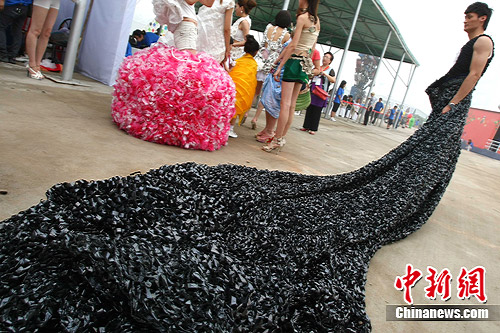 两岸艺术家联手设计“超豪华”塑料袋时装。中新社发 富田 摄