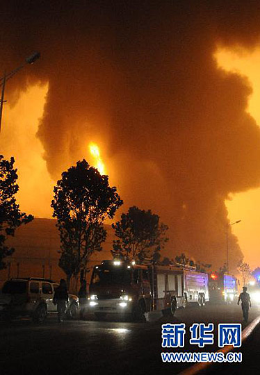 图:大连新港输油管道爆炸 消防官兵在爆炸现场灭火
