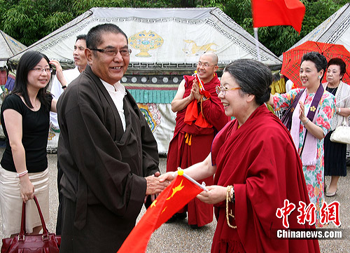 7月16日,中国藏学家活佛代表团一行前往日本名古屋强巴林寺参观交流。强巴林寺是日本国内唯一的藏传佛教寺庙。图为强巴林寺的日本主持强巴曲珍热情地在门口迎接中国佛协西藏分会副会长,活佛直贡穷仓·洛桑强巴。中新社发 王洋 摄