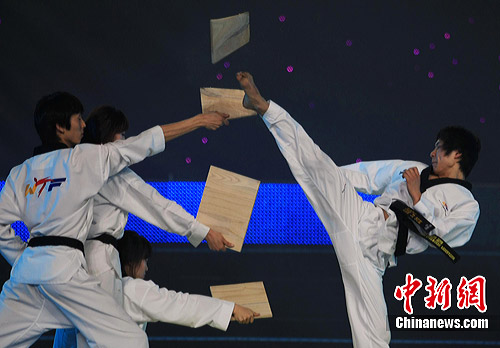 7月16日晚,2010年跆拳道世界杯开幕式在新疆乌鲁木齐举行,来自韩国的选手展示精湛的跆拳道技艺。本届跆拳道世界杯共吸引53个国家和地区的39支参赛队伍参赛,近500名运动员、教练员将于17日至20日进行女子49、57、67、67公斤以上级和男子58、68、80、80公斤以上级的激烈角逐。