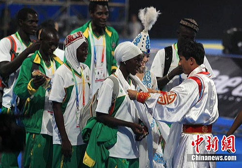 7月16日晚,2010年跆拳道世界杯开幕式在新疆乌鲁木齐举行,非洲选手在入场时获赠洁白哈达,喜笑颜开。刘新 摄
