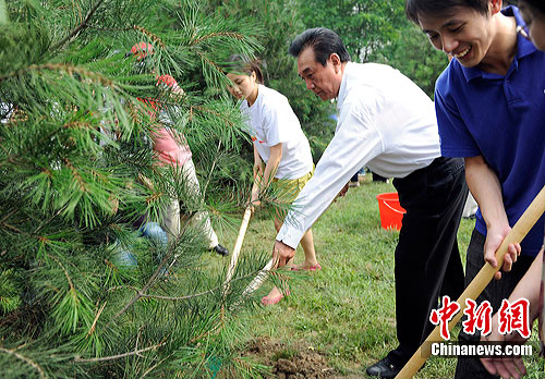 图为揭幕仪式后,海协会会长陈云林和台湾师生共同为“京台青年友谊林”植下了象征两岸友谊地久天长的松树。中新社发 刘震 摄