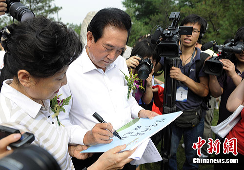 活动仪式后,海协会会长陈云林为两岸年轻人写下了“情牵两岸 树连亲情”的寄语。中新社发 刘震 摄