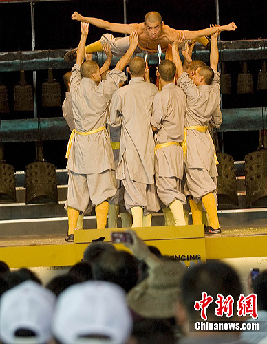 7月17日,上海世博会宝钢大舞台,数根长矛将刀枪不入的河南少林武僧挑起,看的中外游客掌声不断,连连惊呼。中新社发 王中举 摄