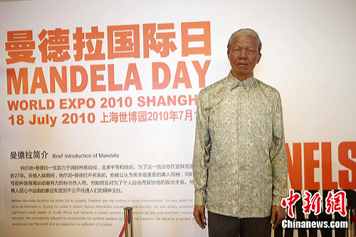 7月18日是国际“曼德拉日”,上海世博会南非馆内为南非前任总统曼德拉举办了盛大的庆祝活动,而上海杜莎夫人蜡像馆应邀将馆内珍藏的曼德拉总统蜡像在活动现场进行为期一天的特别展出。曼德拉本人虽未亲临,但蜡像栩栩如生,吸引了众多游客驻足观赏,不少人表示,凝望蜡像,有如看到总统亲至,对这位南非民族英雄的感动与敬意便油然而生。(李佳佳 摄)