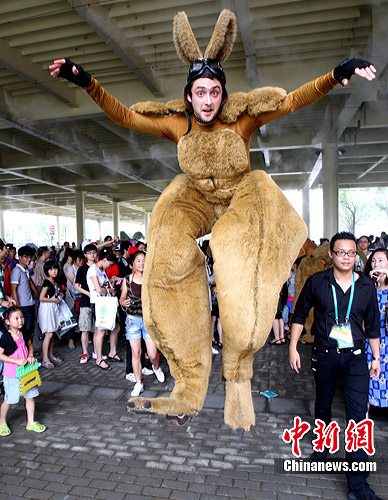 随着暑期来临,参观世博园的客流攀升使各热门馆前“长龙”蜿蜒。不少场馆纷纷推出助兴节目,为排队等候多时的游客解闷。图为一只来自澳大利亚的“袋鼠”为排队等候的游客表演节目。中新社发 汤彦俊 摄
