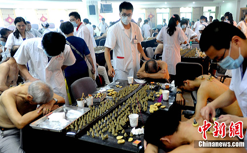 7月19日是今夏三伏天的初伏,福州近千名患者来到福建省第二人民医院接受“三伏灸疗法”治冬病,场面蔚为壮观。“三伏灸疗法”也称“药物发泡”或“敷贴发泡”,起源于秦汉,创新于现代。中新社发 赵隽 摄
