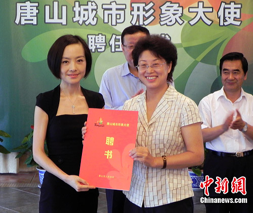 7月18日至19日,凤凰卫视董事局主席、行政总裁刘长乐率领的代表团在河北省唐山访问。此行,著名主持人鲁豫被唐山市政府聘为“唐山城市形象大使”。图为鲁豫从唐山官员手中接过聘书。中新社发 白云水 摄